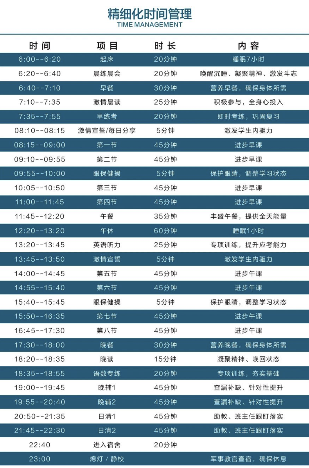作为“6+”提分策略的规划核心,确保合理设置课程体系和作息时间,将教学过程、学习过程、运动与健康、饮食与睡眠有机结合,高效时间管理,科学一日流程规划,把学生的学习状态、身心健康调整到最佳。任课老师、班主任、助教老师24小时与学生同吃同住,全方位无死角对学习进行督促、引导、鼓励,确保学生充分利用每一天的时间,高效完成备考内容,提高备考效率。