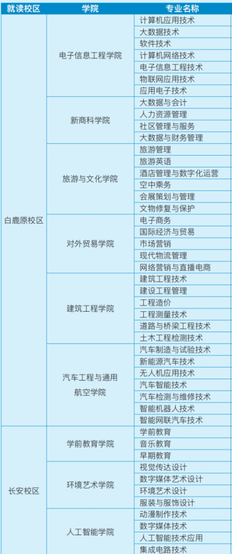 学校设有新商科学院、旅游与文化学院、学前教育学院、建筑工程学院、对外贸易学院、电子信息工程学院、环境艺术学院、汽车工程与通用航空学院、人工智能学院、国际交流与合作学院、马克思主义学院等11个二级学院和陕西职业教育(应用技术)研究院、陕西会展研究院、乌克兰研究中心、乡村振兴规划设计研究院、刘文西绘画艺术研究院等多个教学科研单位。现开设53个专业,其中有本科专业1个、国家“双高计划”专业群1个、陕西省“双高计划”专业群5个,中央财政支持“高等职业学校提升专业服务产业发展能力”重点建设专业2个、国家骨干重点建设专业4个、国家优质骨干专业14个、陕西省重点专业10个、陕西省“一流专业”14个、陕西省高等职业院校专业综合改革试点项目6个,陕西省创新创业教育教学改革试点院系2个。