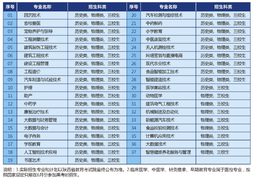 陕西省一流建设(培育)专业:护理、中药学、中医学、学前教育、畜牧兽医、汽车检测与维修技术、建筑工程技术