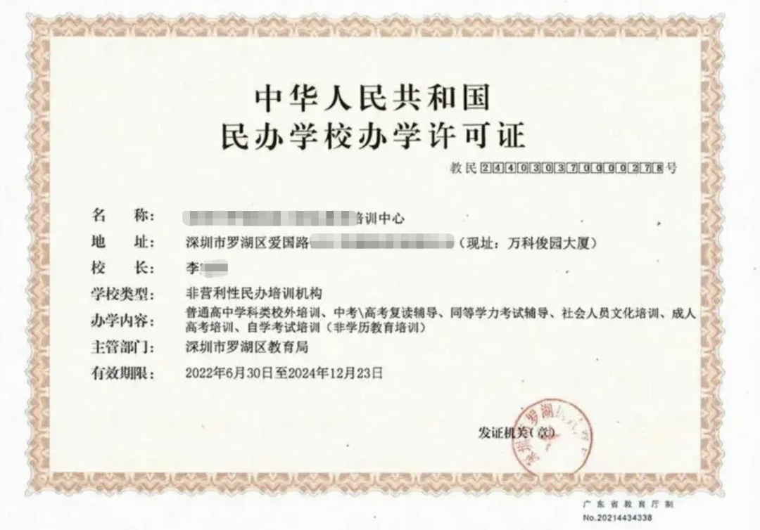 去学校了解,一定要看学校是否具备教育部门颁发的正规办学许可证,一定是教育局颁发的,不能是人社局或者工商局的营业执照,尽量避免选择无资质机构。类似这种属于教育局颁发的,办学类容也很清楚:中考高考复读辅导。
